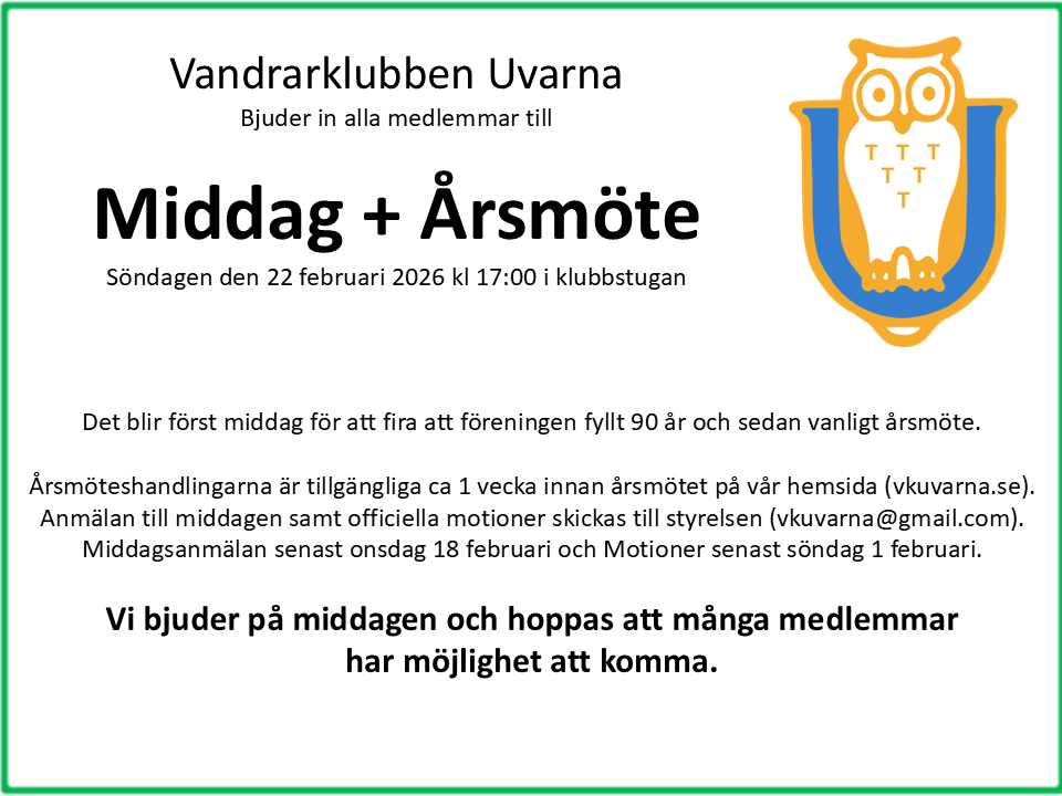 Årsmötet kommer att hållas söndagen den 22 februari i vår klubbstuga. Denna gång kommer vi att uppmärksamma att föreningen fyllt 90 år (11 februari) genom att bjuda alla medlemmar på middag innan mötet.